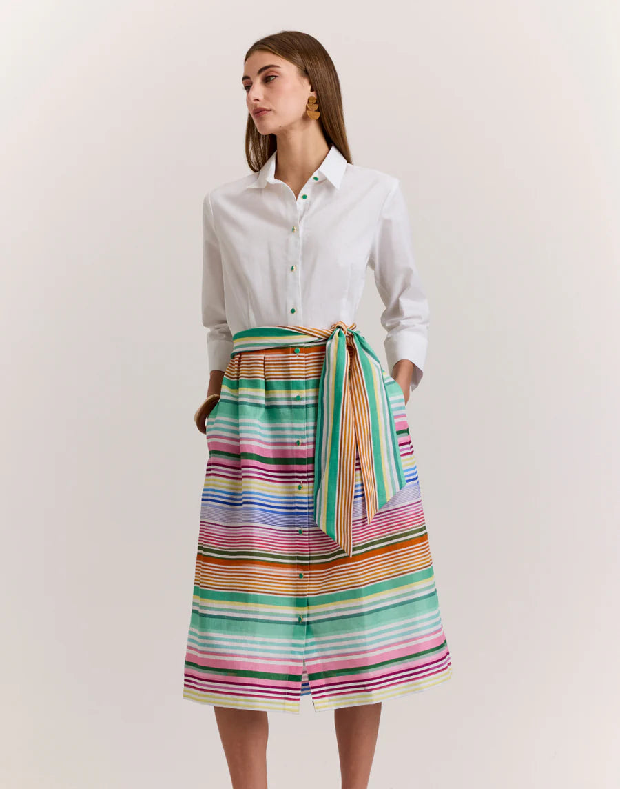 Crafted from a thoughtful blend of linen, rayon, and Sorona, this printed fabric balances breathability with softness and durability. The linen provides a naturally airy feel, while rayon enhances fluidity and Sorona adds subtle stretch and shape retention. The result is a lightweight, comfortable fabric that moves easily and holds its structure throughout the day.
