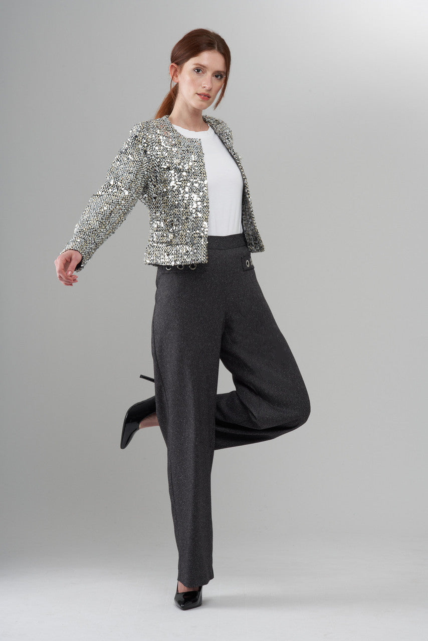 This is a cropped, collarless evening jacket covered in a dense pattern of silver paillettes or large sequins. The paillettes are a mix of metallic tones, giving the jacket a high-shine, textured, and reflective finish that catches the light. The jacket has a simple, straight silhouette.