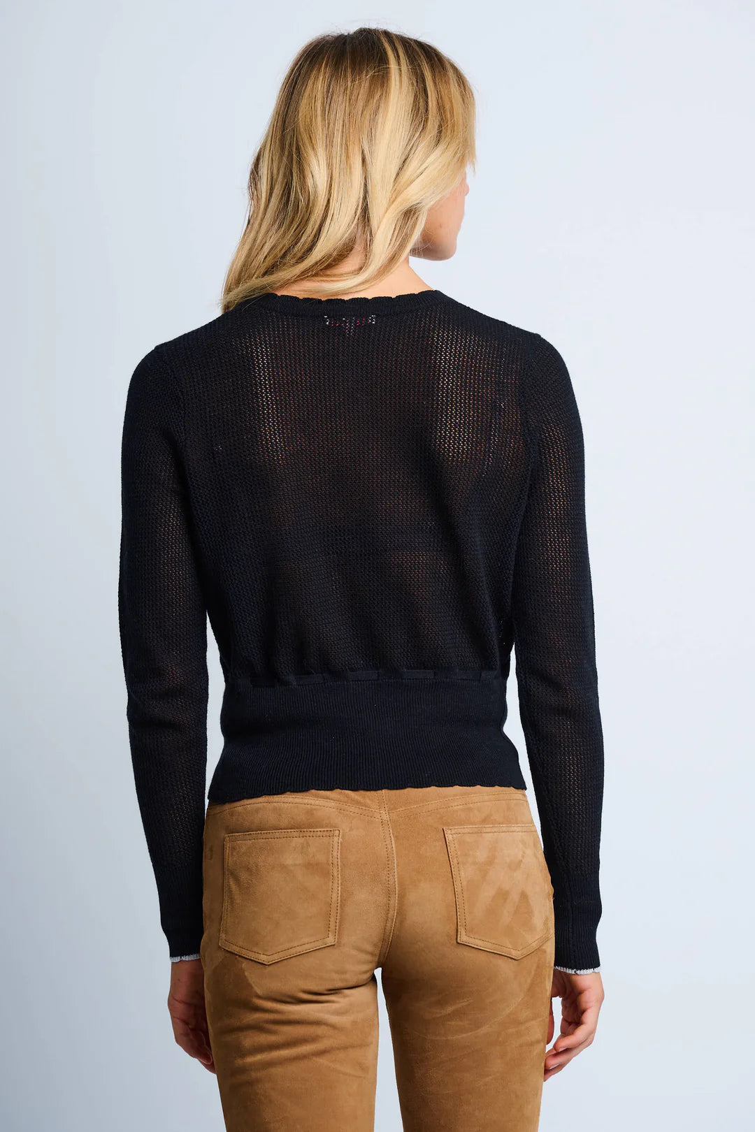 Feminine and refined, The Flirt cardigan features scalloped edging, floral intarsia, and an open-stitch texture. A slim fit silhouette, seven-button closure, and self-tie at the waist lend subtle definition. Crafted in a soft Cotton-Cashmere blend.