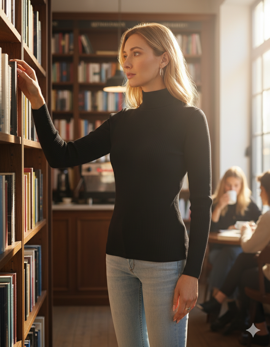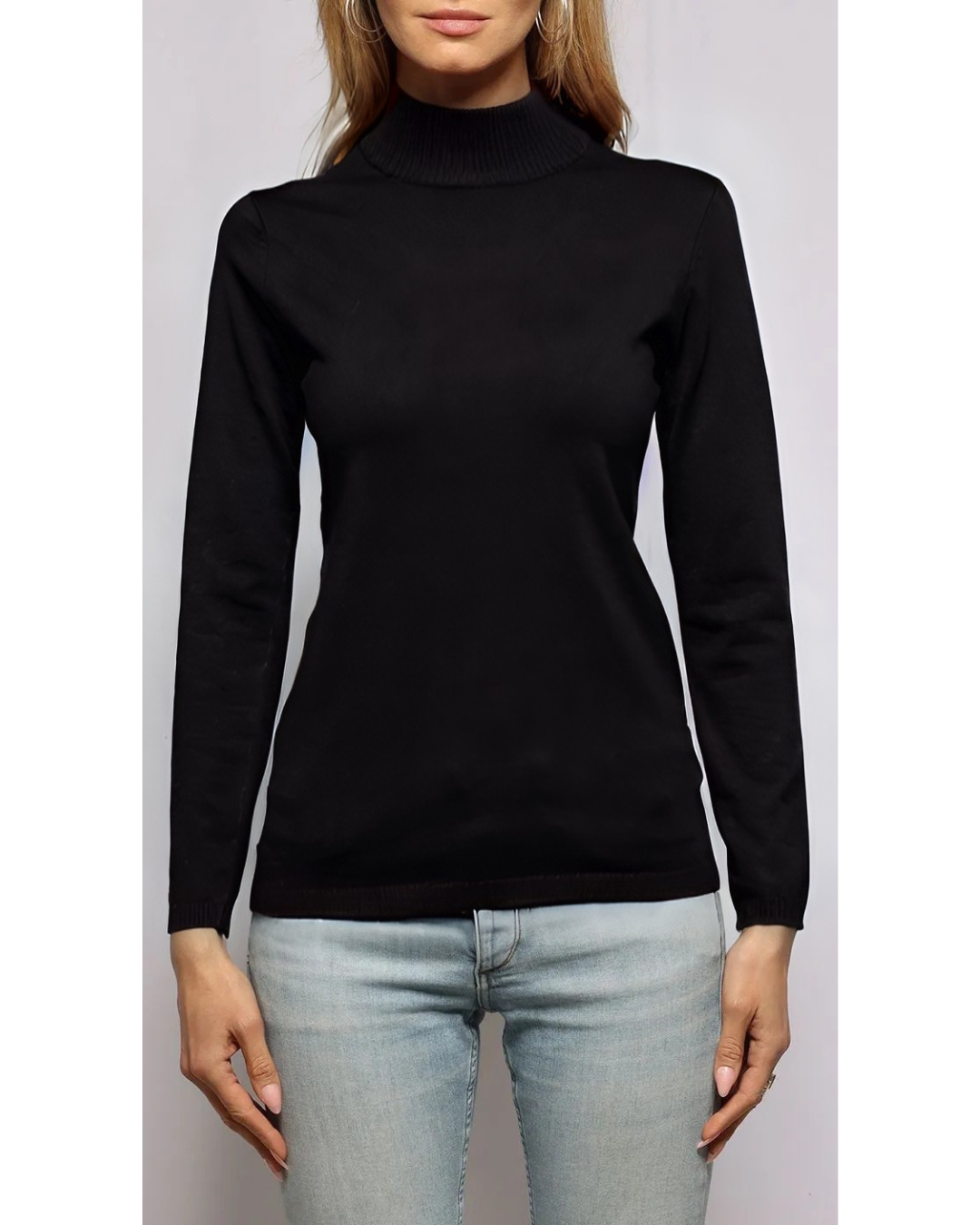 This Mock Neck Long Sleeve Pullover is a classic and versatile knit top in solid black. It features a snug mock neckline that provides warmth and a chic, clean line. The sweater has a relatively slim fit through the body and long sleeves, making it an excellent base layer. Subtle rib trim is visible on the mock neck and the straight hemline, lending a structured finish to the piece. The timeless design makes this pullover a wardrobe essential.