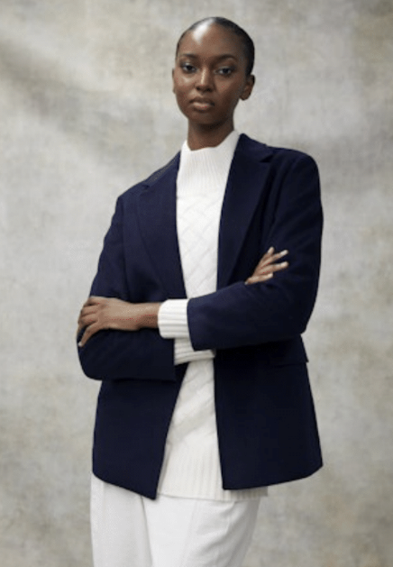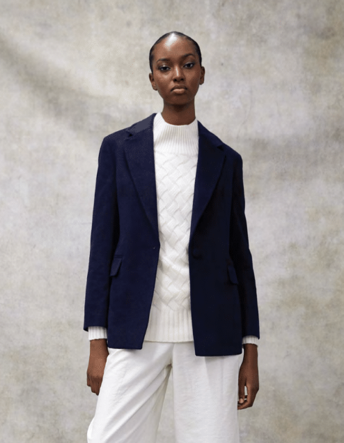 This is a timeless single-breasted blazer in a deep navy hue. Designed with a structured yet relaxed fit, it features sharp notched lapels, a single front button closure, and flap pockets for a polished finish. The long sleeves and tailored cut add a refined edge, making it a versatile layering piece. The blazer balances sophistication with effortless modern style—perfect for both professional and elevated casual looks.