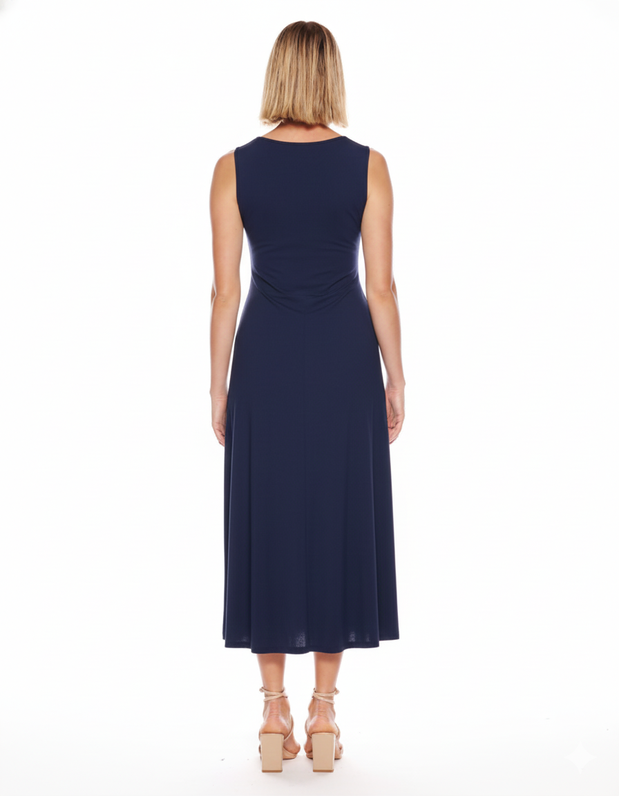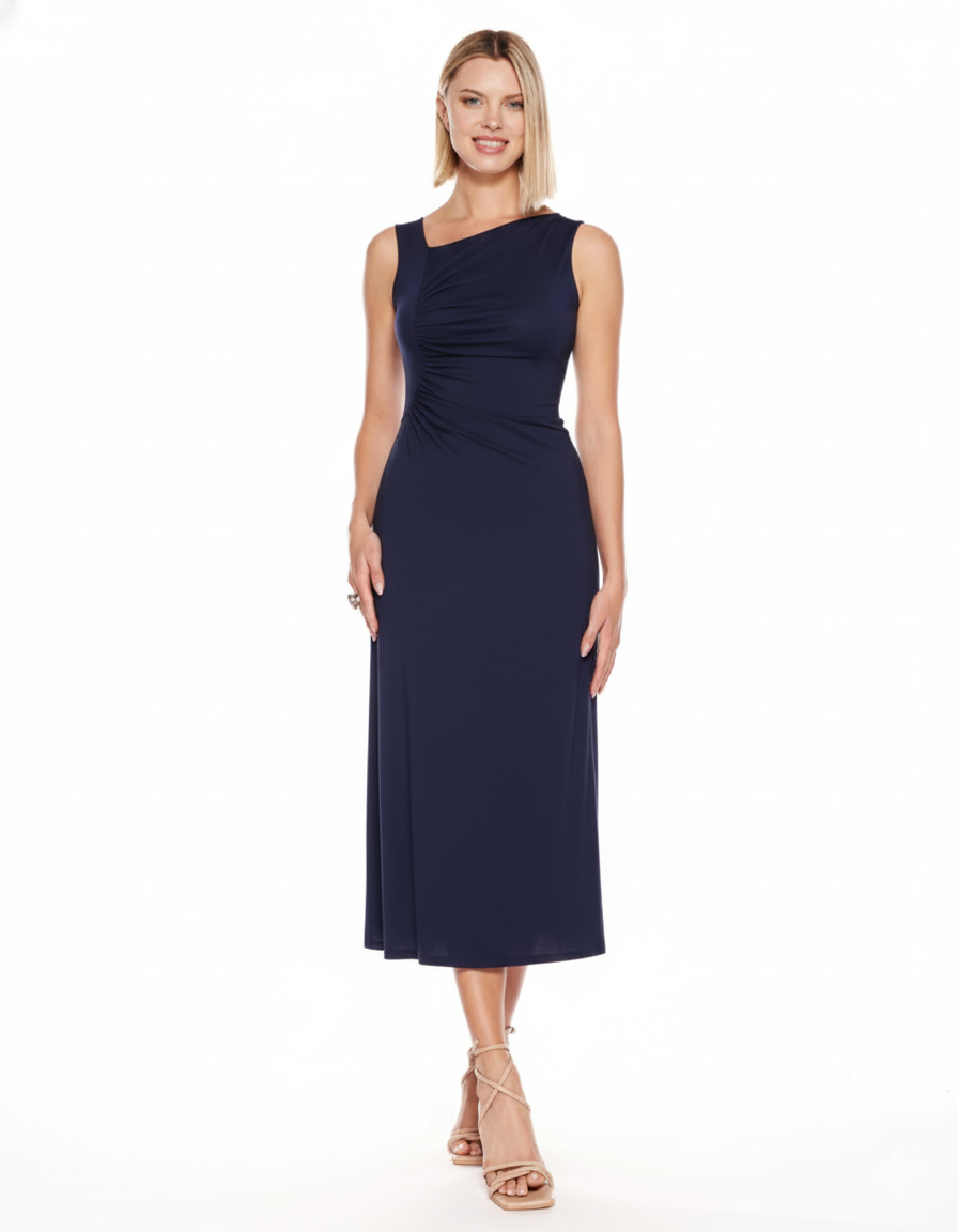 The Tavern Dress is a sleeveless, midi-length piece. The front view shows an asymmetrical neckline and gathered ruching across the bodice, adding texture and shaping the silhouette. The dress has a modest, flowing fit that ends above the ankle. This style is versatile for both for semi-formal or cocktail occasions.