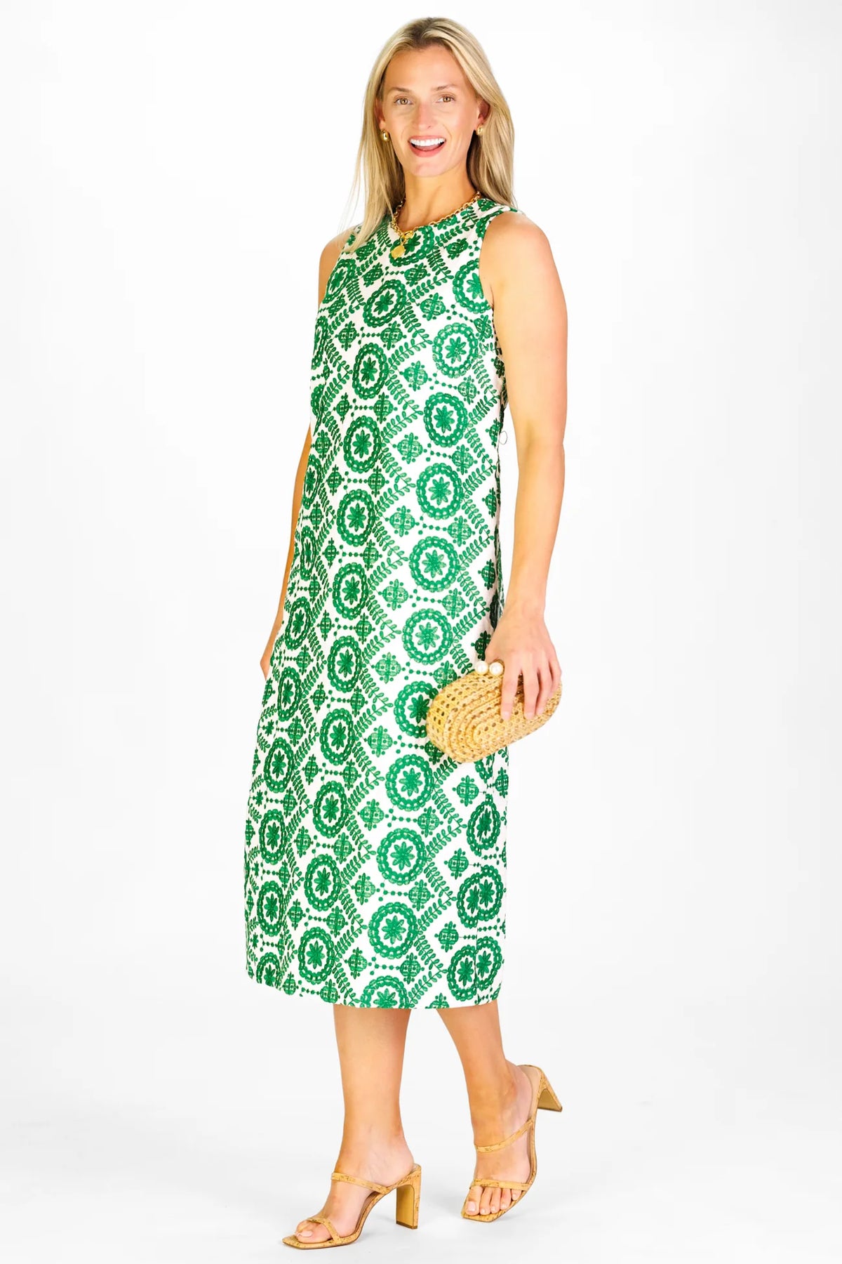The women's Colette Dress with emerald embroidery detail is simple, crisp, and quietly flattering. Designed with a streamlined sleeveless silhouette, it lets the detail shine while keeping the shape effortless. An easy piece that feels timeless and is made to stand out.