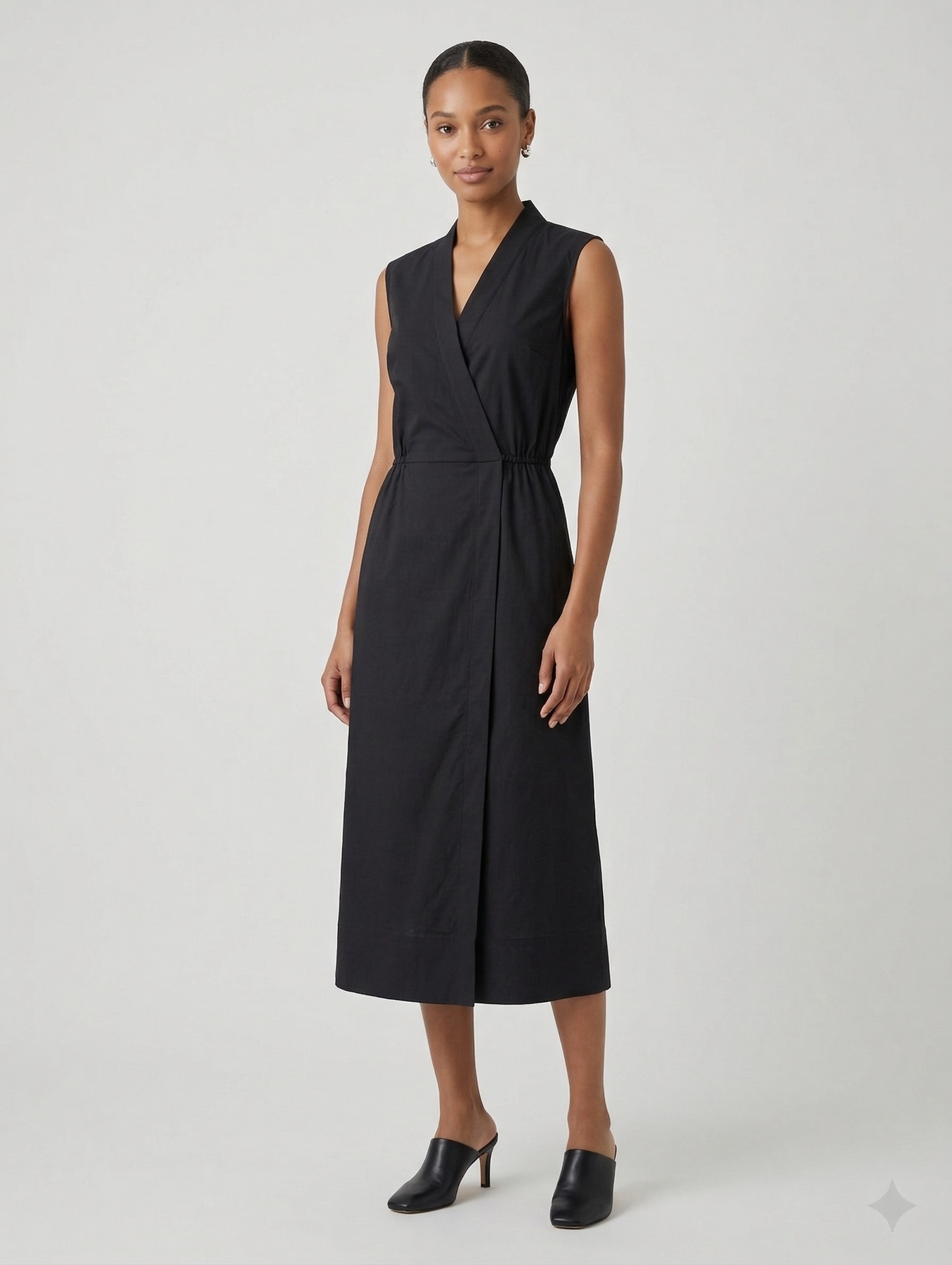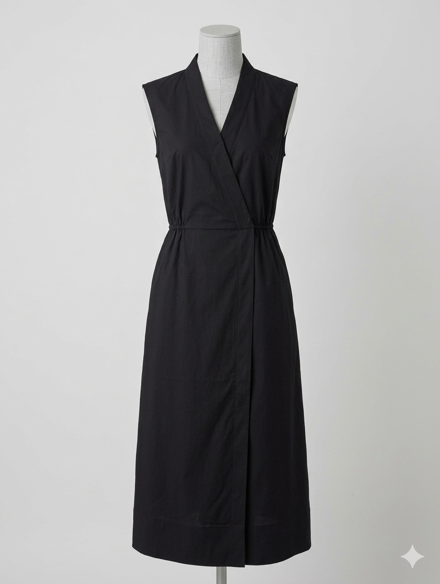This sleek maxi dress features a deep V-wrap neckline and a cinched drawstring waist that ties into a statement bow at the back, blending minimalist structure with an elegant, dramatic finish. Crafted in a crisp, lightweight fabric with a flowing asymmetric hem, it's an effortlessly sophisticated piece that dresses up or down with ease.