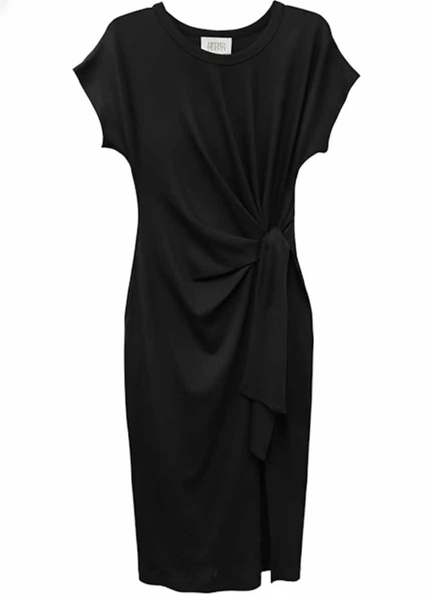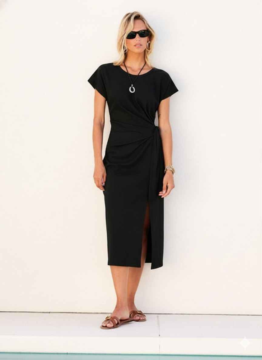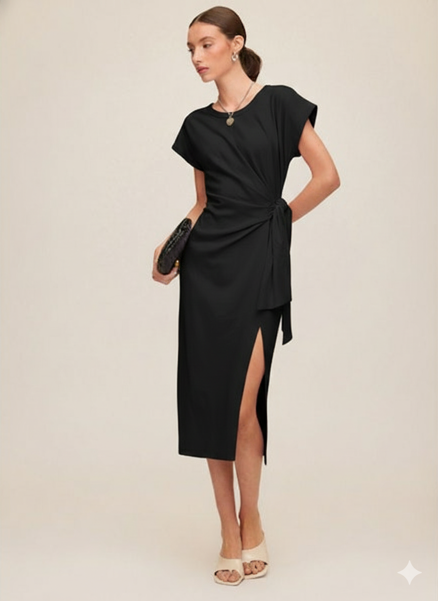 The Marisa Side-Knot Midi Dress blends modern elegance with effortless ease. Crafted with a clean crew neckline and sleek short sleeves, it features a flattering side-knot detail that softly shapes the waist for a refined, feminine silhouette. A bold side slit adds movement and a touch of allure, while the midi length keeps the look sophisticated.