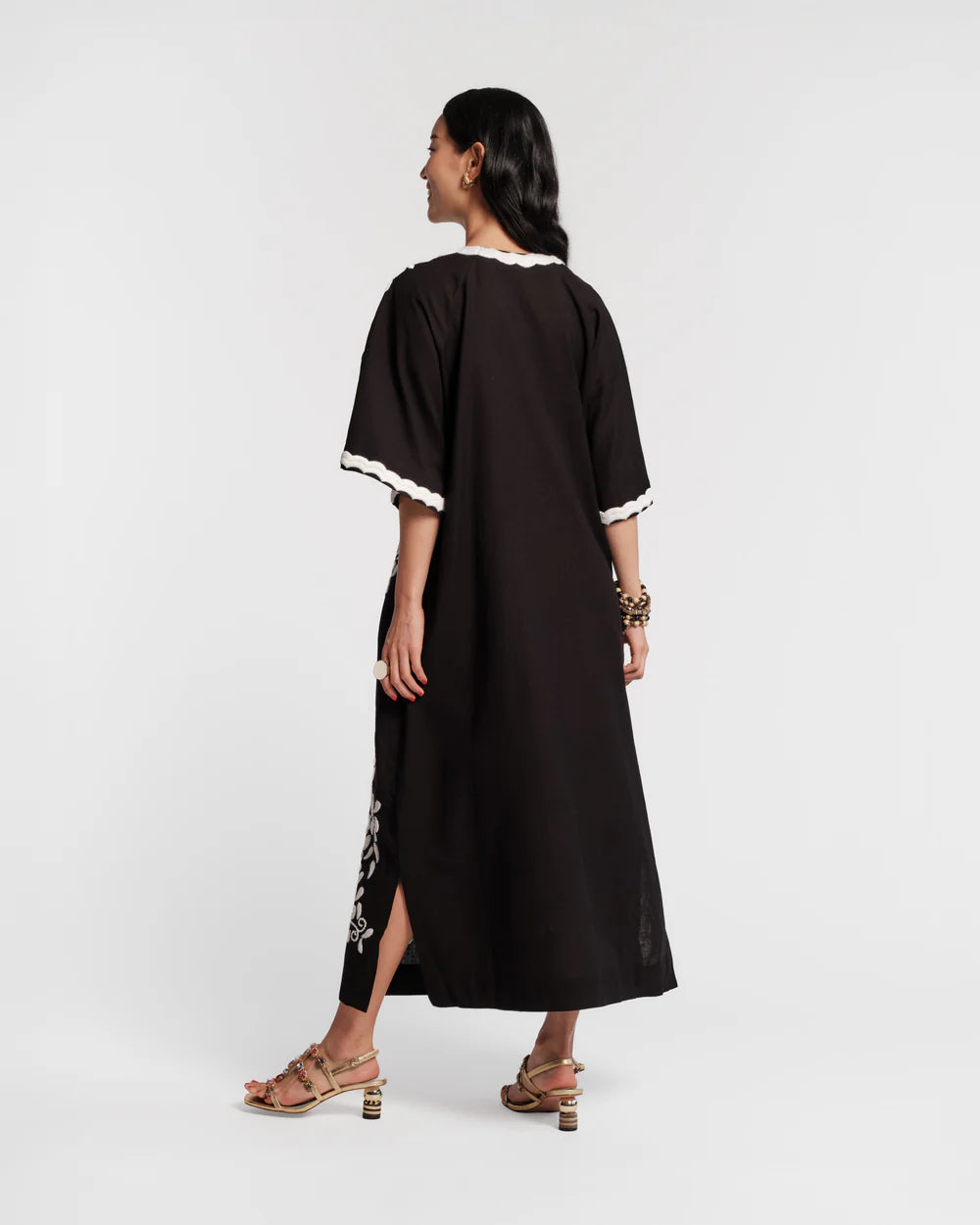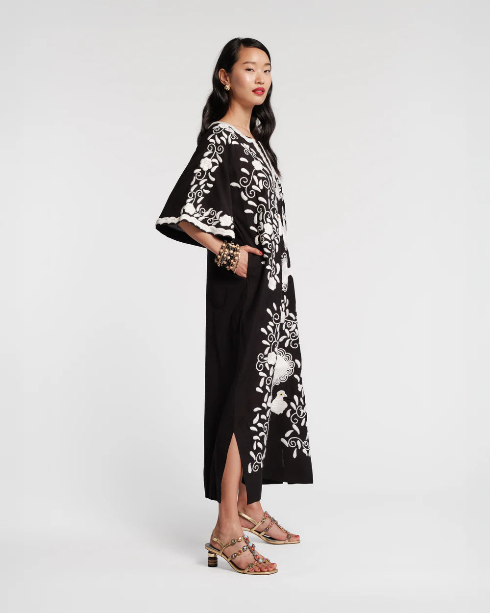 The Charming Caftan returns, bringing effortless elegance to long, sun-dappled days. With sweeping bell sleeves and subtle side slits that move with ease, this breezy silhouette nods to vintage glamour while feeling right at home in the modern wardrobe. It's the kind of piece that turns heads quietly and earns compliments without saying a word.