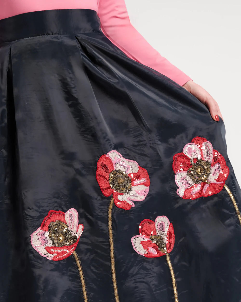 Talk about a standout. The Shea Maxi Skirt brings just the right dose of drama. A full skirt cut in a rich night-sky navy and finished with four sequined poppies, it’s a wearable work of art. The silhouette is easy and elegant, made to move with you. Pair it with a tee for the day or a Whitney Wrap Top for the evening. Bonus points for a comfortable elastic back and, yes, pockets.