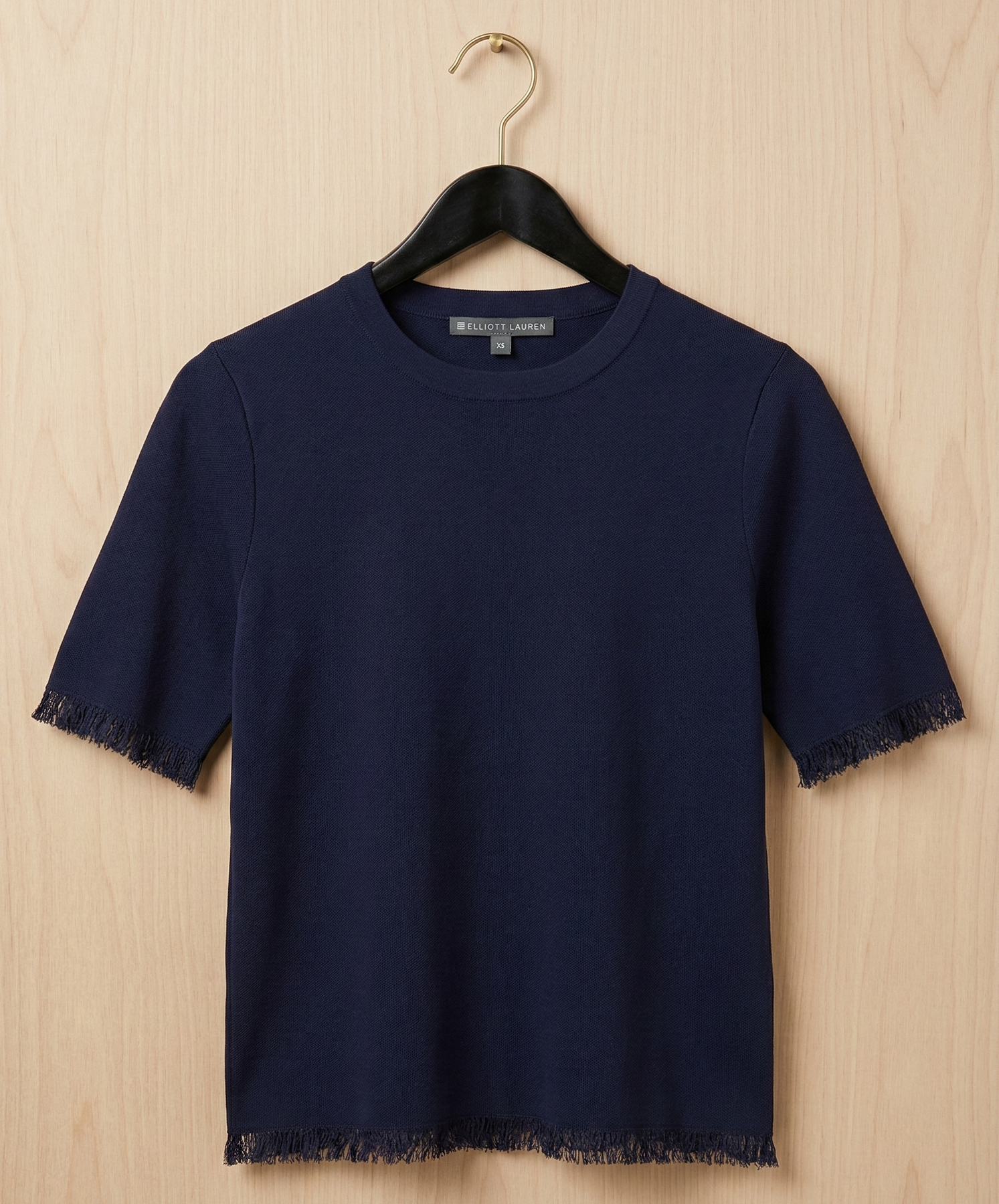This chic, short-sleeved sweater features a crisp hue and a subtle textured knit that adds depth to its minimalist design. It is defined by its modern crew neckline and relaxed silhouette, but the standout detail is the delicate fringe trim lining the cuffs and the bottom hem. This raw-edge finish provides a playful, bohemian touch to an otherwise structured and sophisticated staple piece.