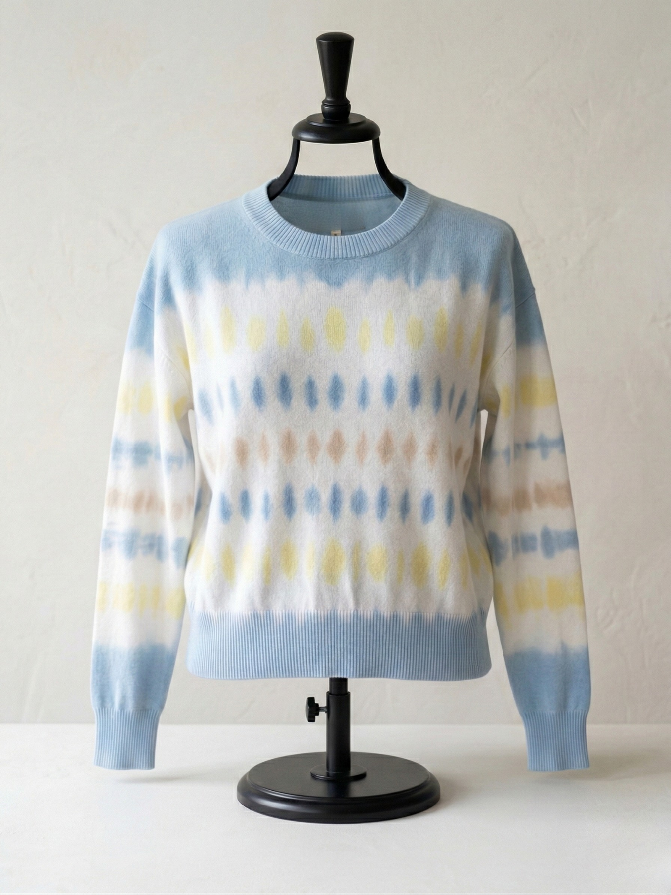 This chic, crew-neck sweater features a unique tie-dye-inspired horizontal pattern that transitions from a soft sky blue at the top and bottom into a clean white midsection. The design is accented with earth-toned diamond motifs in shades of pale yellow, muted blue, and tan, giving it a modern, artisanal aesthetic. Finished with classic ribbed detailing on the collar, cuffs, and hem, it offers a relaxed yet polished fit that pairs perfectly with casual denim.