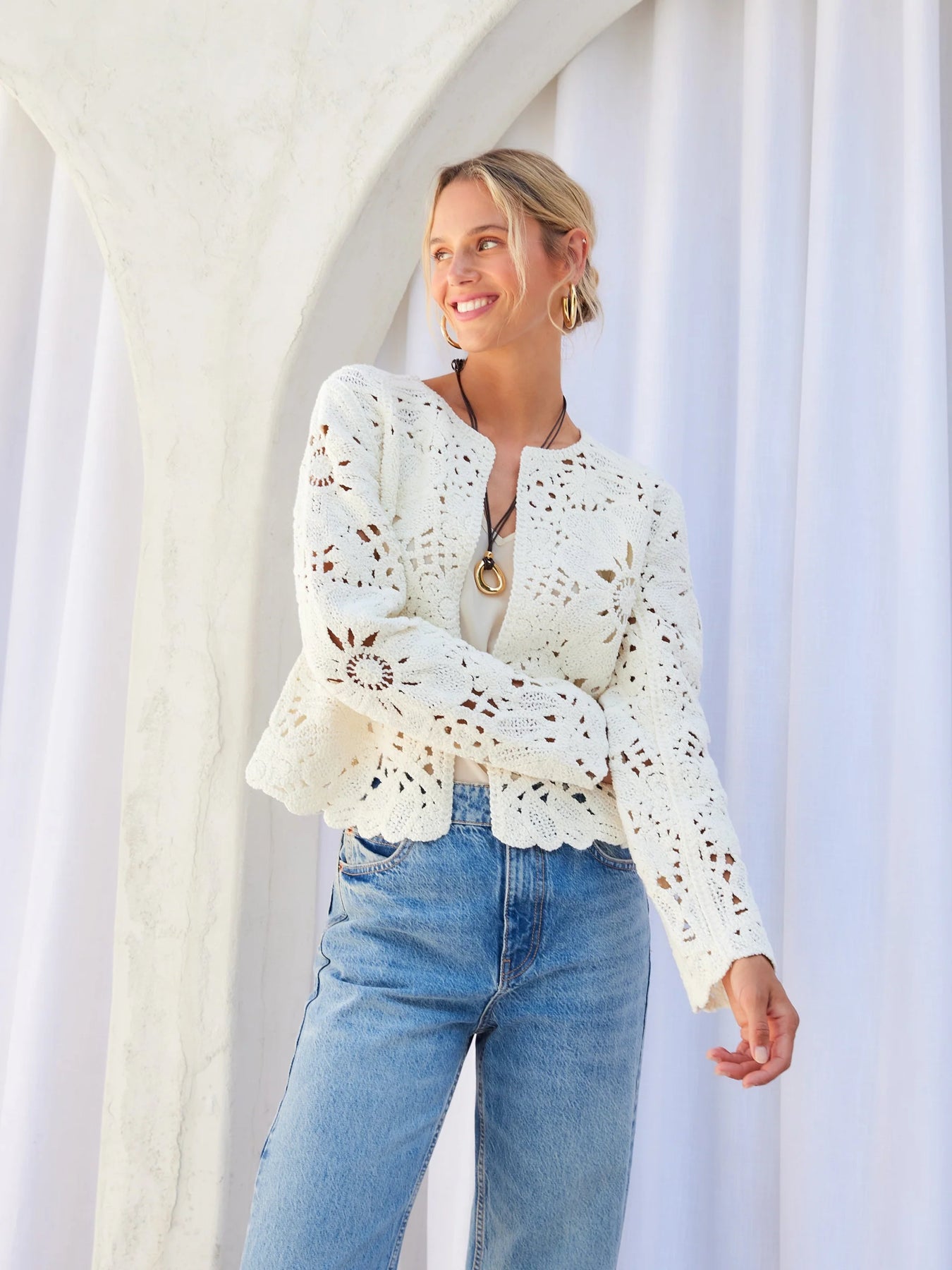 This open-front crochet jacket features long sleeves and intricate cutwork throughout, finished with delicate scalloped edging along the hem and cuffs. A lightweight layer with beautiful texture and feminine detail.