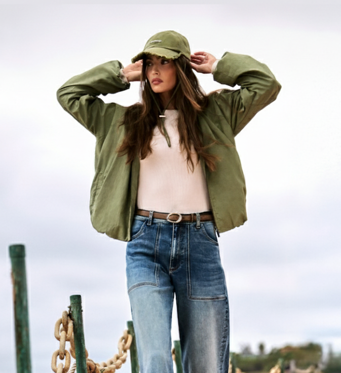 This olive green bomber-style jacket features a relaxed, voluminous silhouette crafted from a lightweight, matte fabric. It is characterized by intricate gathering around the mock-neck collar and shoulders, which creates a soft, draped effect throughout the bodice and sleeves. The jacket includes a full-length metallic front zipper and an elasticized hemline that cinches at the waist to provide structure to its oversized fit. The sleeves are designed with a dropped shoulder and wide, slightly tapered cuffs, giving the garment a modern, utility-chic aesthetic.