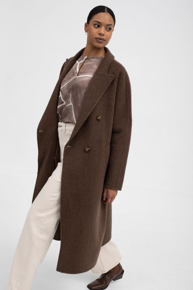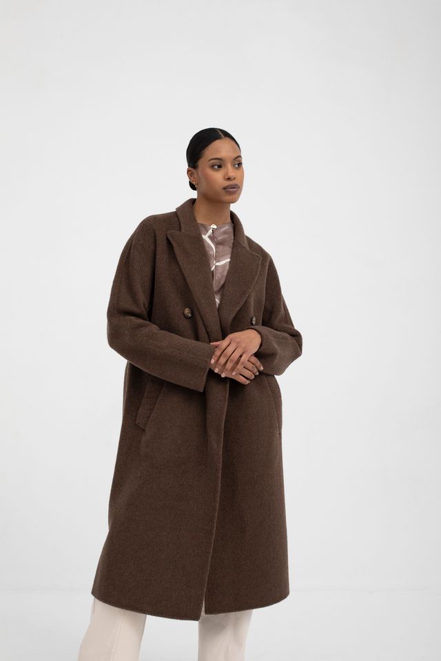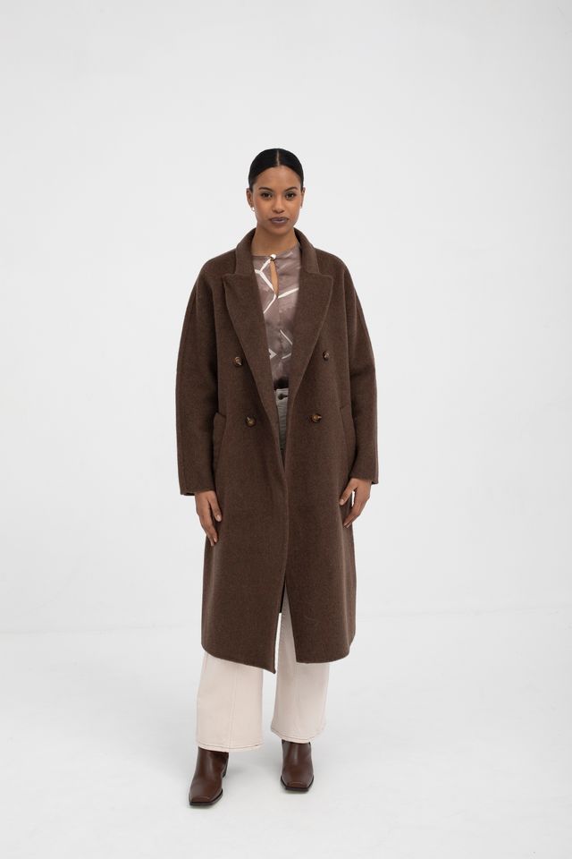 The Louvre Coat is a classic double-breasted coat in a versatile chocolate brown color. It has a relaxed, slightly oversized fit, with broad notched lapels and a long length that falls below the knee. The coat features two rows of contrasting brown buttons and a visible, soft, and textured material giving it a cozy and elegant feel. Its clean lines and minimal detailing make it a timeless outerwear piece suitable for a sophisticated, layered look.