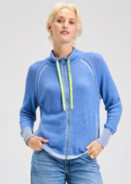 This is a two-tone zip-up hoodie with a sporty, casual design. The main body of the garment is a heathered blue, and it's accented with bold, contrasting details. A prominent, bright neon yellow zipper runs up the front, with matching yellow drawstrings at the collar. The hoodie also features distinctive white stitching that outlines the raglan sleeves and forms a decorative, curved line on the front. The cuffs and the bottom hem have a different pattern—a checkered or gingham-like pattern in light blue and white—adding another layer of visual interest and a subtle mix of textures. The hoodie is a soft, knit texture and has a relaxed fit.