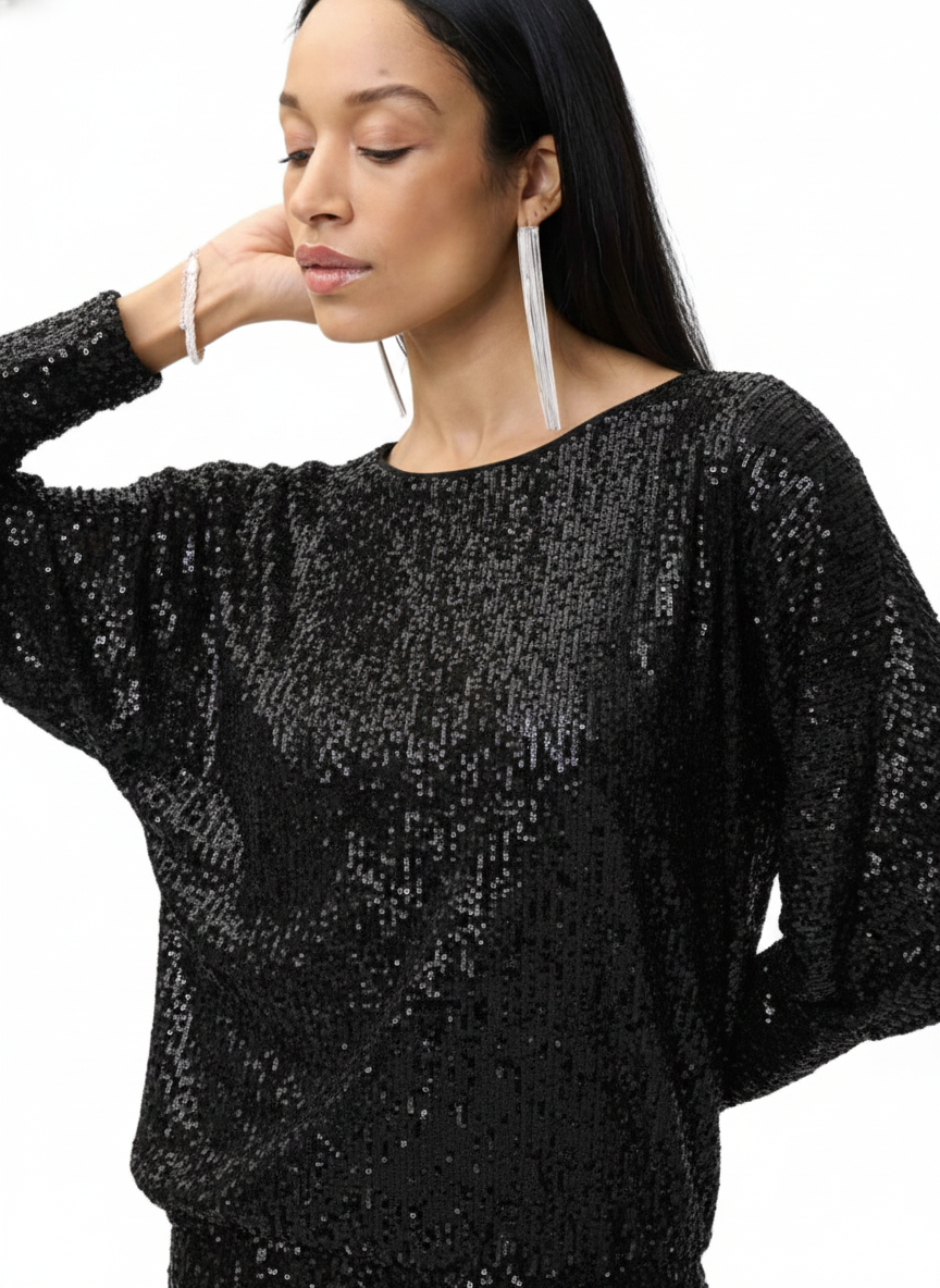 Shine on in this sequin top by Joseph Ribkoff. Featuring feminine balloon sleeves, and a boat neckline, this style is sure to dazzle.