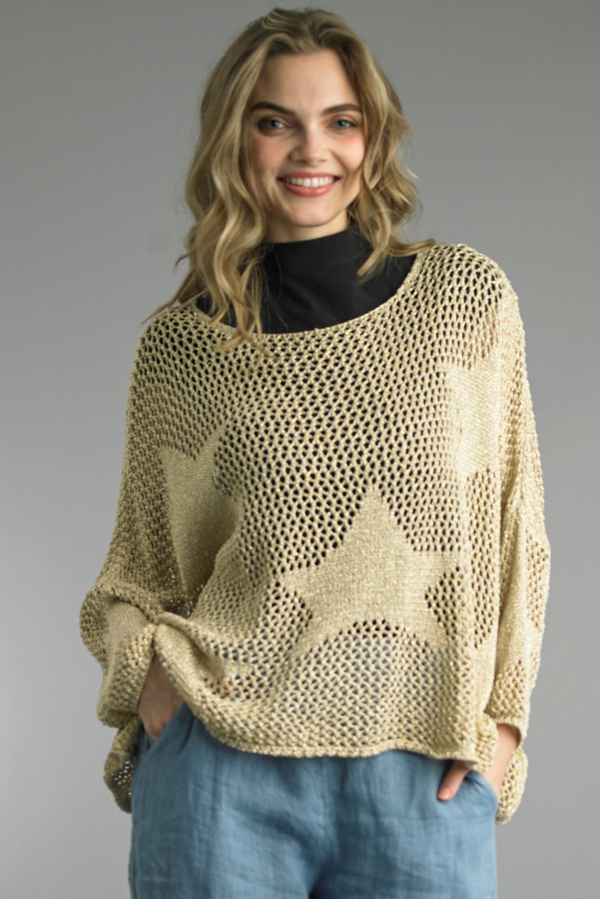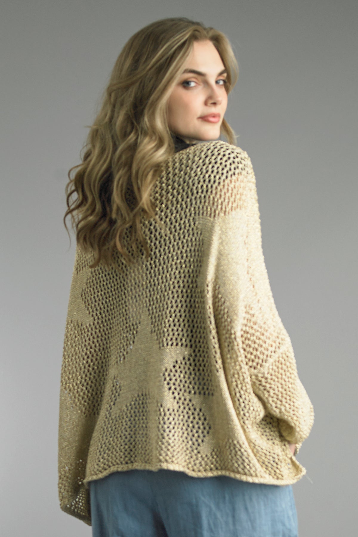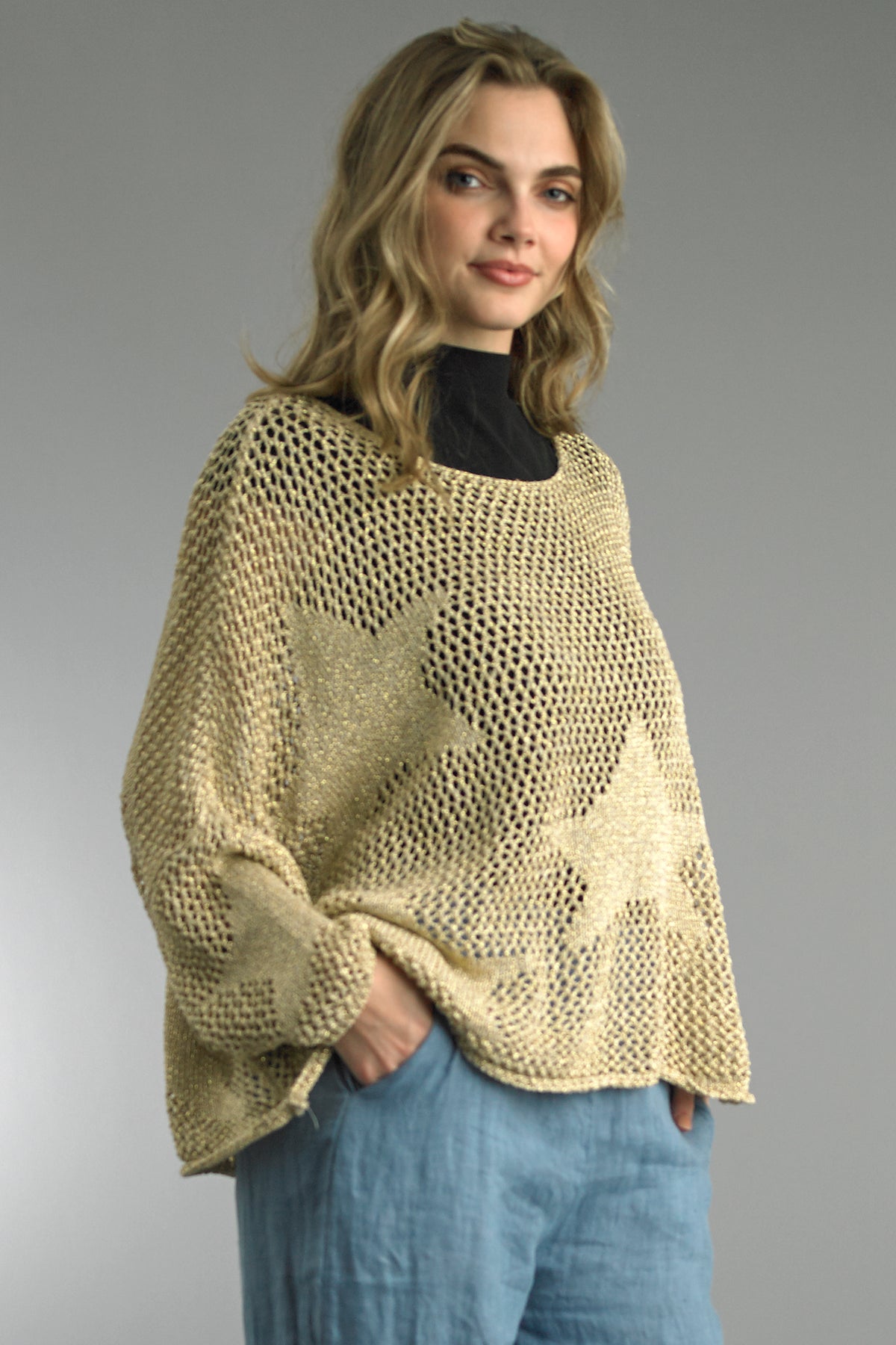 This shimmering gold knit sweater offers a playful yet sophisticated take on layering. With its relaxed silhouette and eye-catching star motif, it’s a versatile piece that transitions effortlessly from a casual daytime look to an elevated evening ensemble.