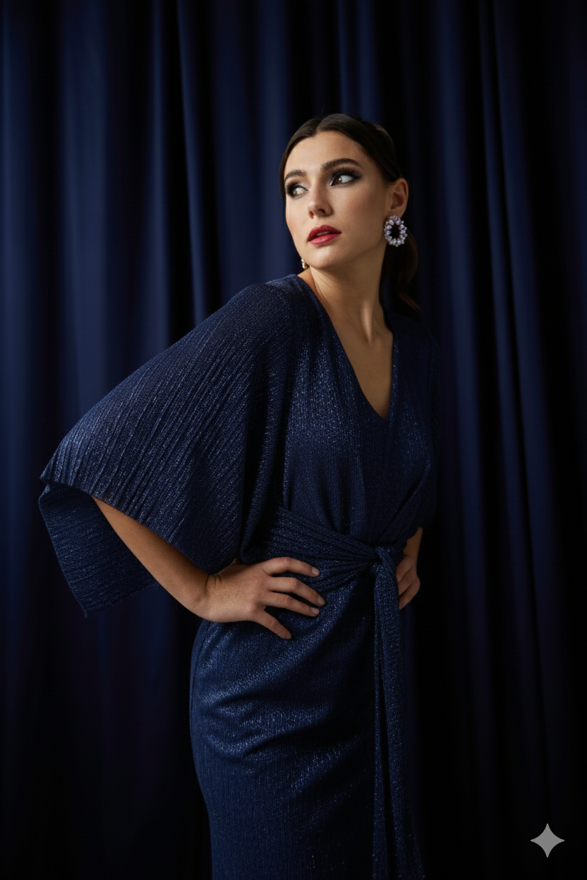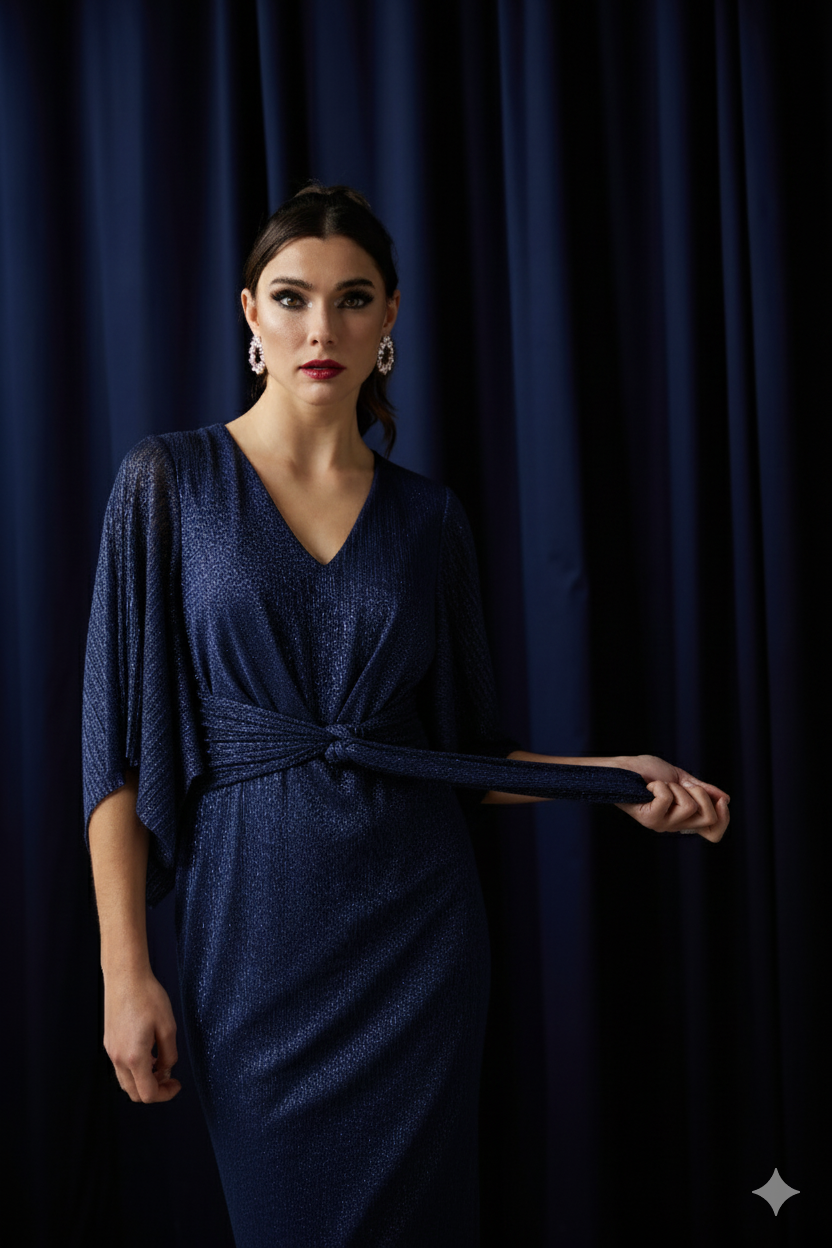 This flattering Joseph Ribkoff dress is cut in an irresistibly soft, stretchy fabric. Its drapey sleeves exude elegance while its belted waist defines your curves and flatters your figure. For any soirée, this look will surely stun.