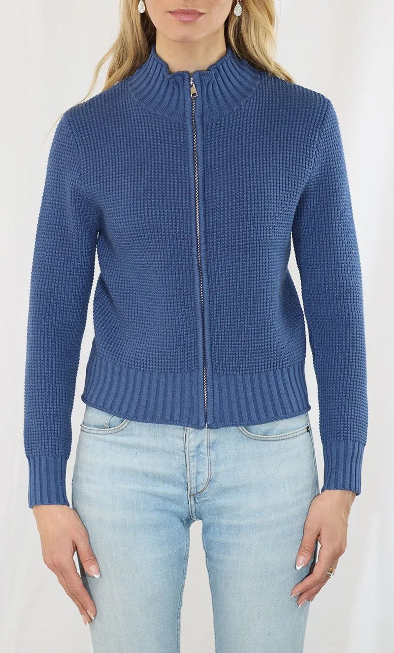 The Texture Stitch Mockneck Zip Front Cardigan is a cozy and versatile knitwear piece in a calming blue hue. It features an appealing texture stitch, giving the garment a rich, tactile surface. The mock neck design, which zips fully up the front, offers a comfortable, structured neckline that can be worn up for warmth or partially zipped down for a more relaxed look. The full-zip front adds functionality and a modern touch, while ribbed cuffs and hem provide a neat finish and help maintain the cardigan's shape. This piece is ideal for effortless layering over a variety of outfits.