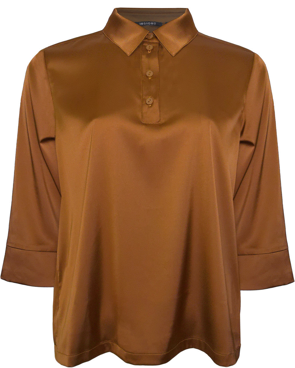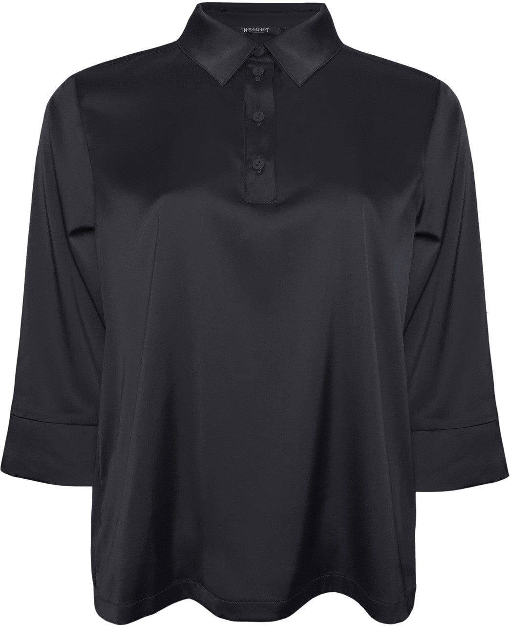 This elegant satin top is presented in a sophisticated solid black and walnut color. It features a classic collared neckline with a four-button placket that opens halfway down the chest. The fabric has a luxurious, soft satin sheen, giving it a dressy feel. It has three-quarter length sleeves that finish with wide, turn-back cuffs, lending a tailored and polished look. The silhouette is relaxed and flowing, with a subtly rounded hemline, making it a versatile piece that can transition seamlessly from professional wear to evening attire.