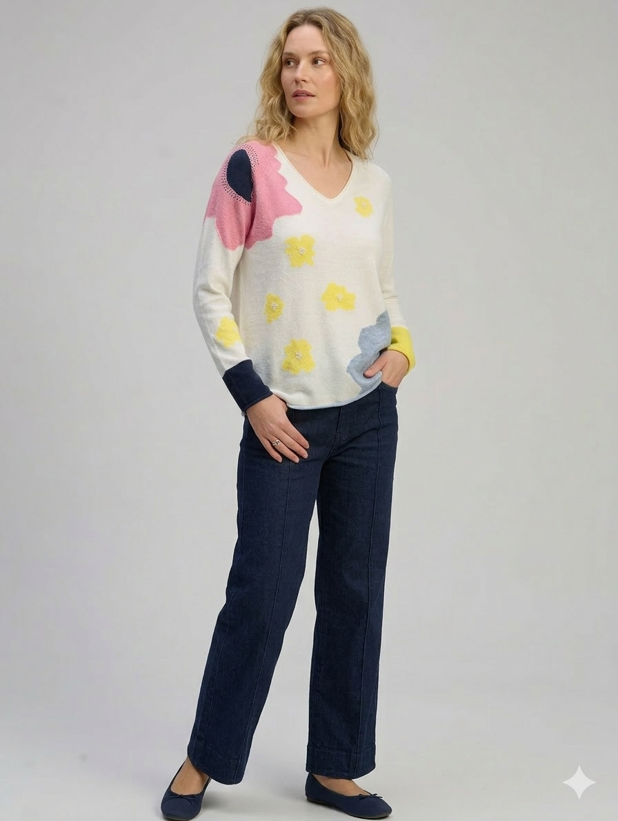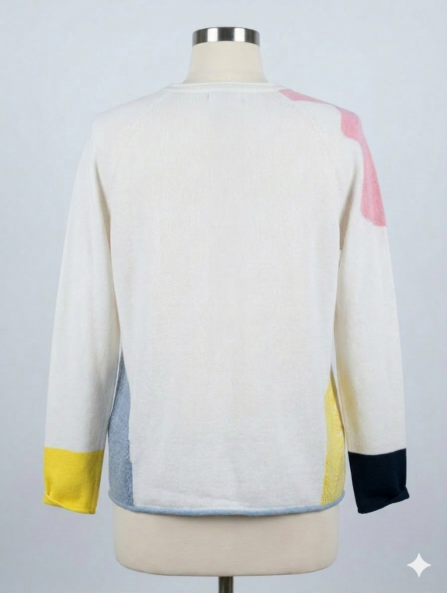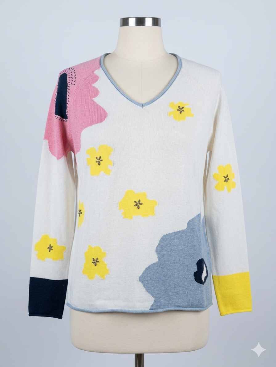 This Zaket & Plover "Garden Pond" Sweater is a whimsical, contemporary piece that leans heavily into the brand's signature playful aesthetic. It combines a clean, minimalist silhouette with bold, abstract intarsia knitting.